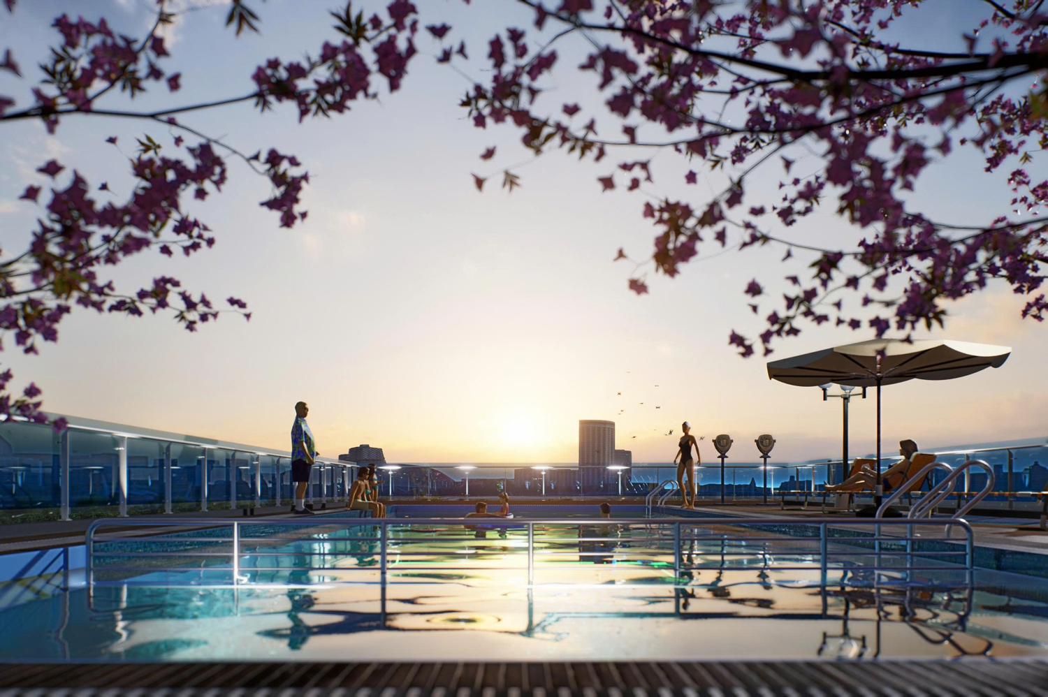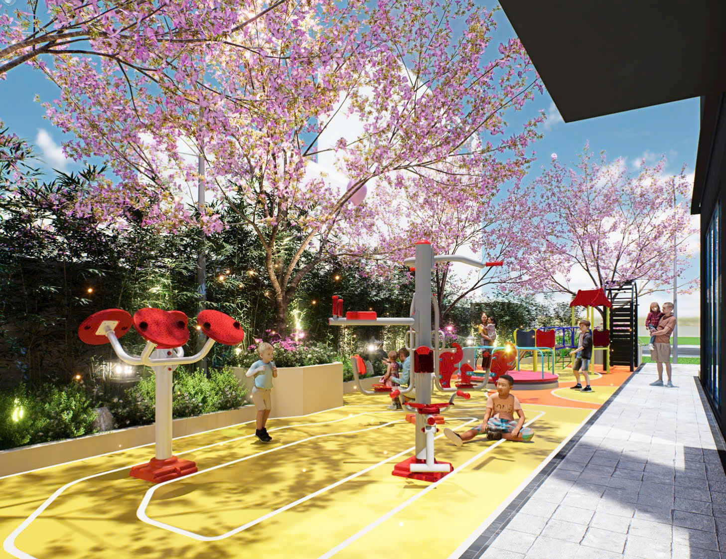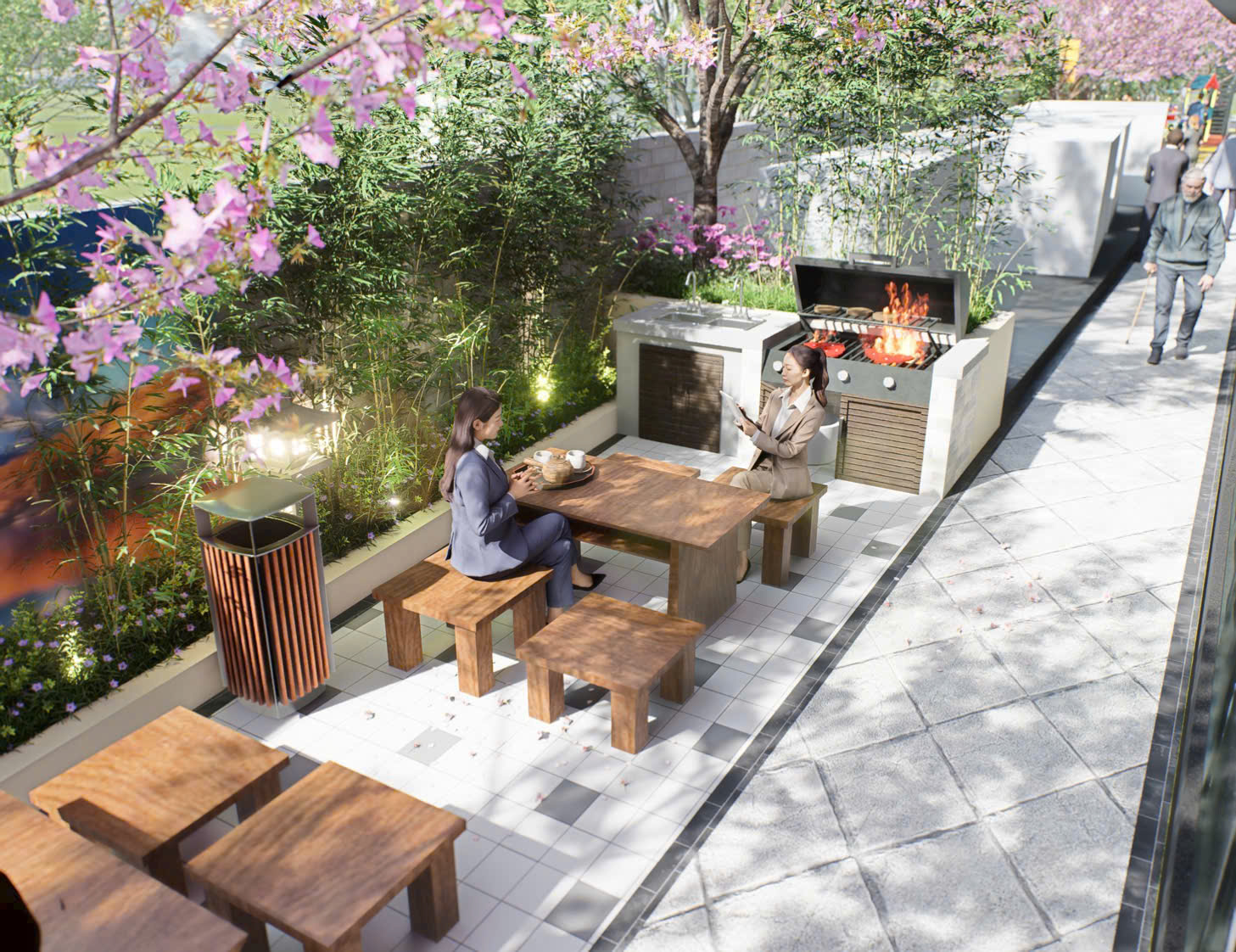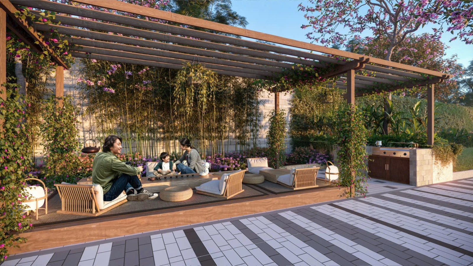 Nổi bật là: Hồ bơi ở tầng 4, khu BBQ, vườn thiền trên cao, khu vui chơi trẻ em, sân thể thao, đường dạo bộ cây xanh, khu tập yoga, khu đọc sách ngoài trời, vườn hoa anh đào, cung đường kèn hồng, shophouse thương mại tầng trệt…