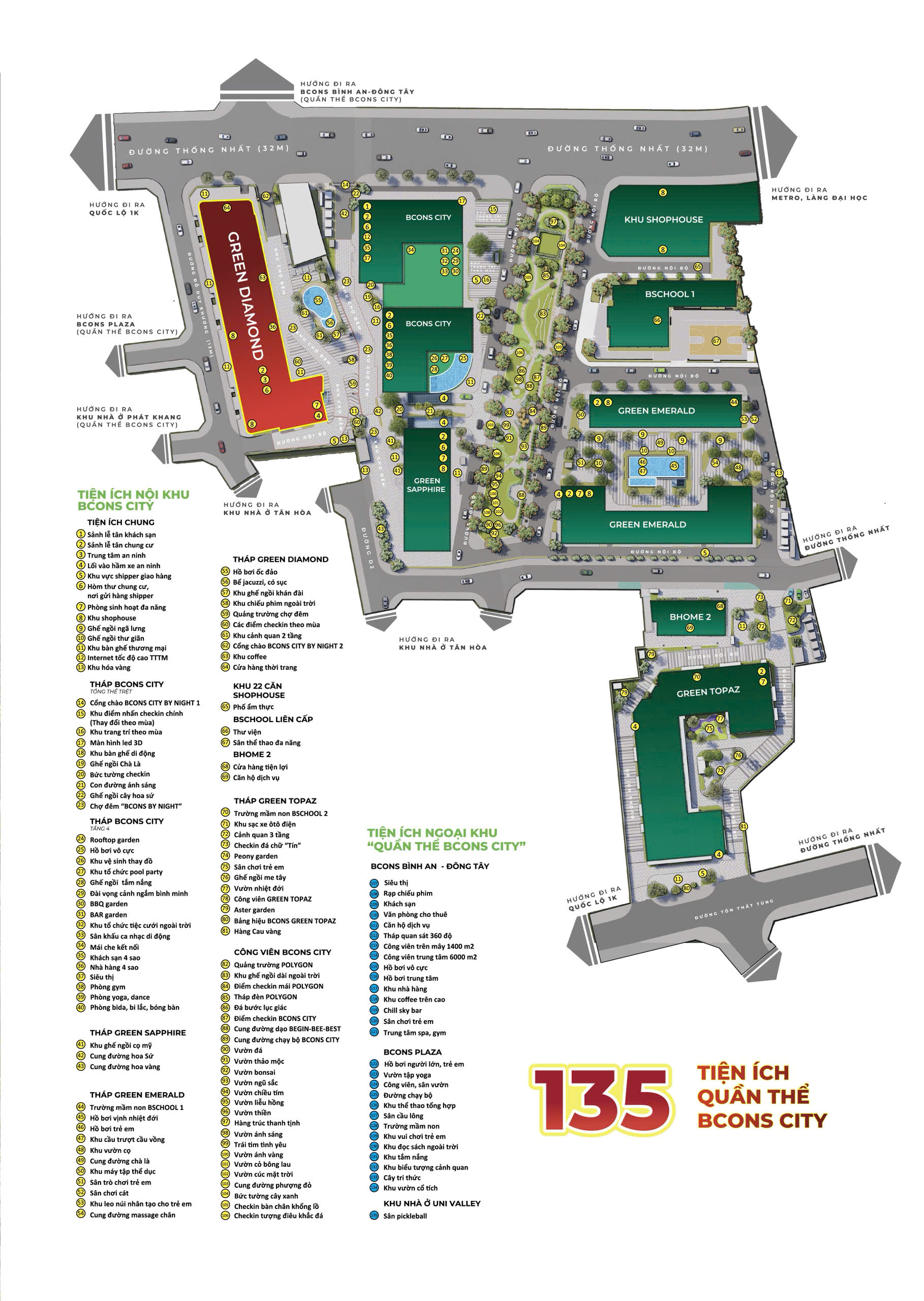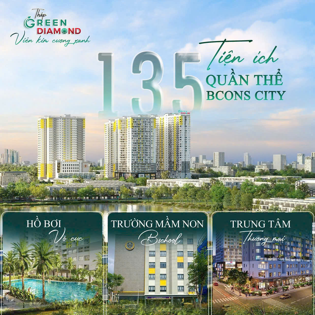 Hưởng lợi từ 135 tiện ích nội khu của khu phức hợp Bcons City, cư dân Tháp Green Diamond sẽ không cần phải lo lắng về các nhu cầu sinh hoạt thường ngày. Với 70% diện tích đất cho tiện ích nội khu, dự án được triển khai các tiện ích mà ít dự án trong khu vực có được như:
